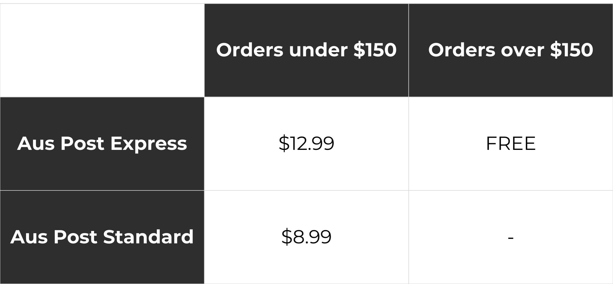 We send all orders with Australia Post. You can choose from Express or Standard delivery options at the checkout. Please note, our delivery estimates are based on the most up to date information from Aus Post themselves.